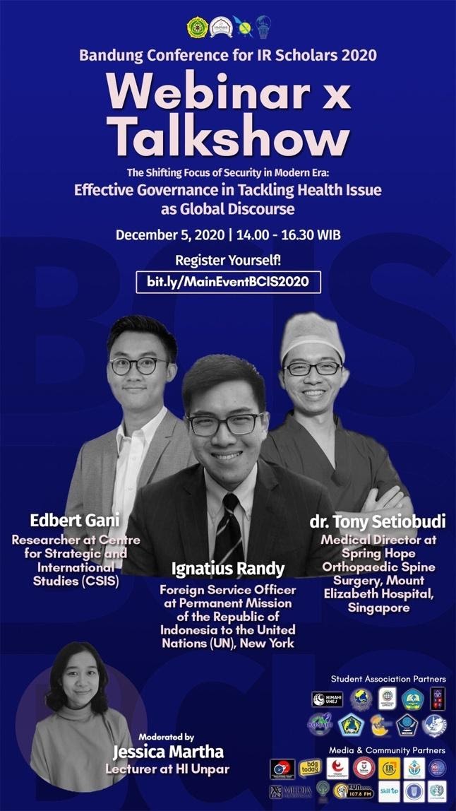 Mata acara utama yaitu webinar dilaksanakan pada tanggal 5 Desember 2020 dimana didalamnya terdapat 3 pembicara yang hebat, yaitu Edbert Gani yang merupakan peneliti di Centre for Strategis and International Studies (CSIS), Ignatius Randy yang menjabat sebagai Foreign Service Officer at Permanent Mission of the Republic of Indonesia untuk Perserikatan Bangsa-Bangsa di New York, dan dr. Tony Setiobudi sebagai Medical Director at Spring Hope Orthopaedic Spine Surgery di Rumah Sakit Singapura Mount Elizabeth. Acara tersebut bertema Pergeseran Keamanan di Era Modern: Tata Kelola yang Efektif dalam Menanggulangi Isu Kesehatan Sebagai Wacana Global. Diskusi dan talkshow membicarakan tentang upaya pemerintah Indonesia dalam menanggulangi Pandemi COVID-19 baik dengan kerjasama multilateral maupun kebijakan negara Indonesia itu sendiri.