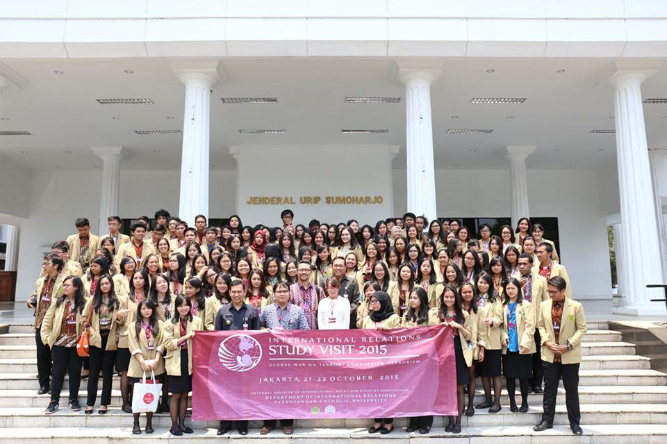 Divisi Eksternal Himpunan Mahasiswa Program Studi Ilmu Hubungan Internasional (HMPSIHI) UNPAR menggelar acara study visit ke Jakarta pada tanggal 21-22 Oktober 2015 lalu. Acara yang terbuka bagi mahasiswa jurusan Hubungan Internasional UNPAR angkatan 2013 dan 2014 ini, bertema “Global War on Terror: Countering Terrorism”. Pada hari pertama, para peserta dibagi menjadi tiga bus (Bus A, B, dan C), dimana masing-masing bus memiliki tujuan berbeda. Tempat-tempat yang dikunjungi oleh bus A antara lain Kedutaan Besar Selandia Baru dan ke Pusat Pelaporan dan Analisis Transaksi Keuangan (PPATK), lalu bus B mengunjungi Kedutaan Besar Jerman dan DENSUS 88, kemudian bus C berkunjung ke Kedutaan Besar Irak di Indonesia dan Centre for Strategic and International Studies (CSIS). Sementara di hari kedua, semua peserta mengunjungi Kementerian Pertahanan Republik Indonesia dan Kementerian Luar Negeri Republik Indonesia. (Nadya Ridha Irfany & Gadis Gladya)
