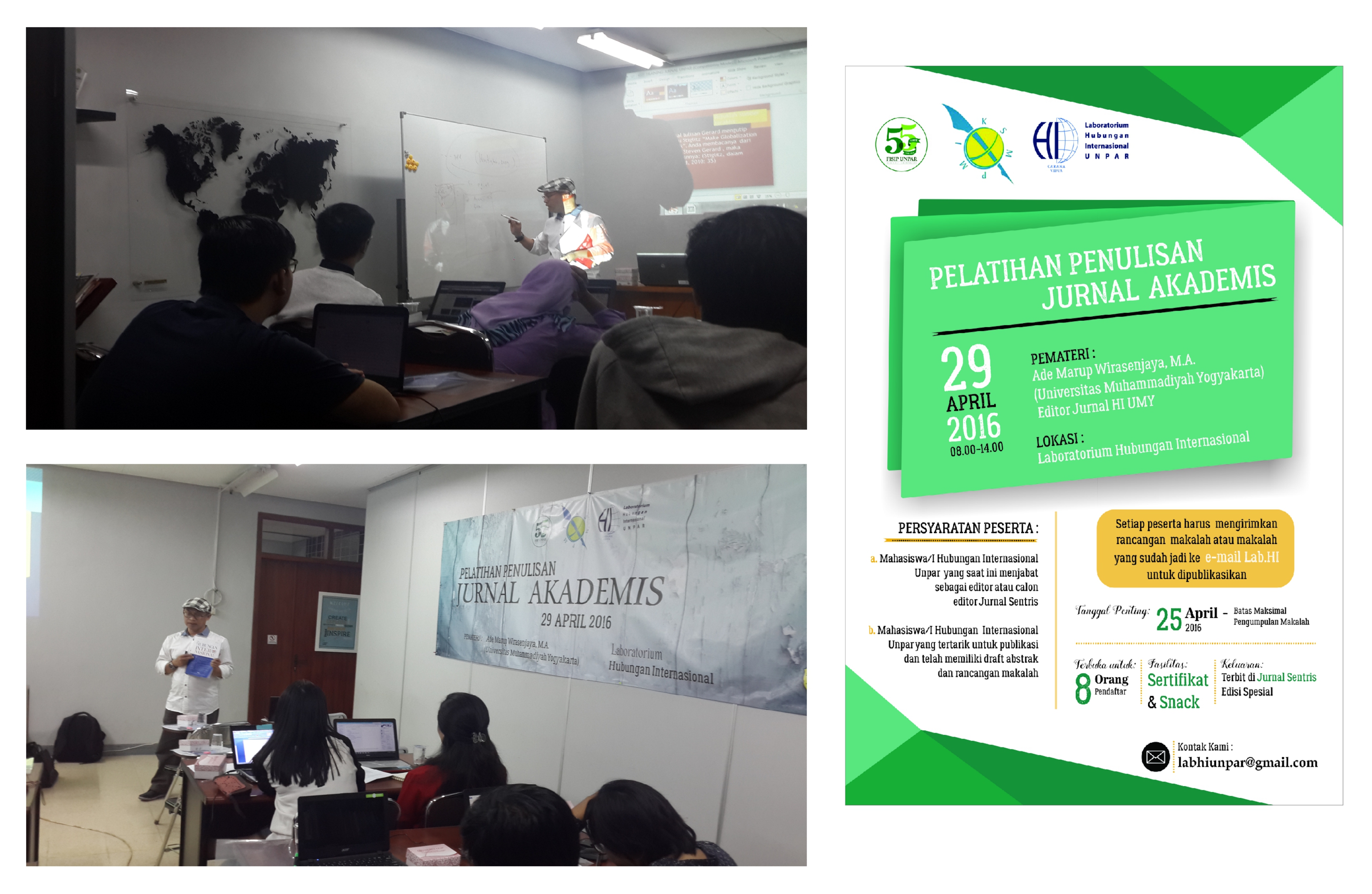 Pelatihan penulisan jurnal akademis kali ini menghadirkan Ade Marup Wirasenjaya, M.A (Editor Jurnal Hubungan Internasional-Universitas Muhammadiyah Yogyakarta) dan dimulai pada pukul 08.00-14.00. Selain mendapatkan sertifikat, makalah para peserta pelatihan pun akan dipublikasikan pada Jurnal Sentris.